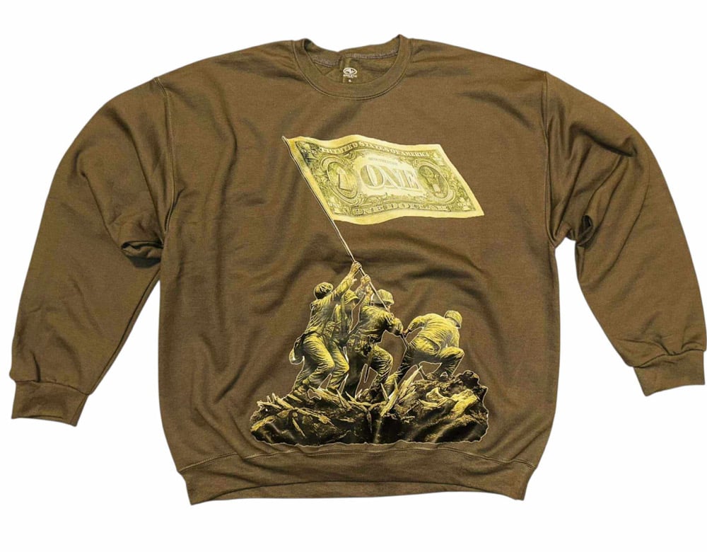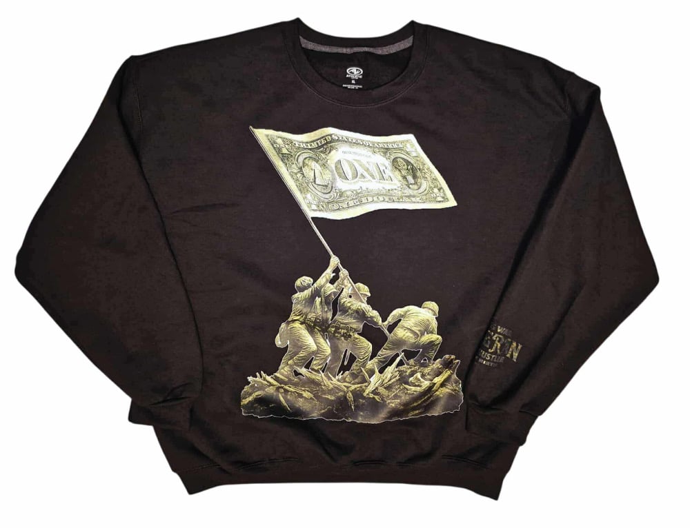 Thick Cotton Graphic Crewneck Sweatshirt Depicts A Famous Battle Win By Our Country, But Flipped The Flag To A Dollar Bill To Represent “The American Way”, Which Is Power Through War, & Our Focus On Capitalism