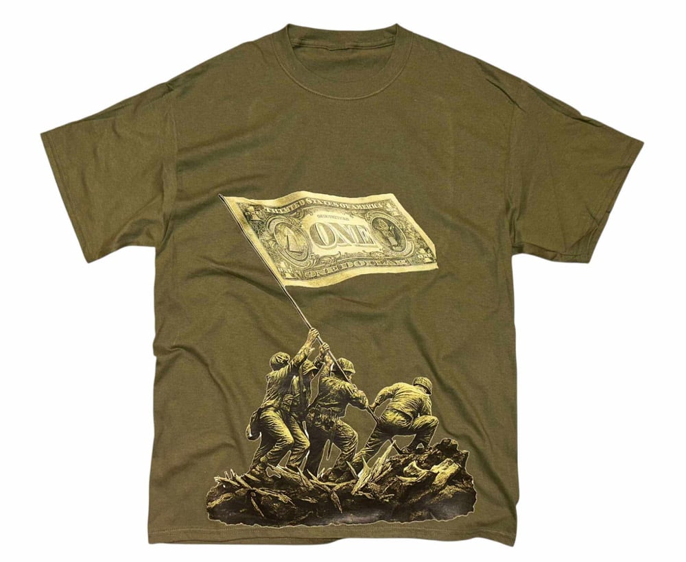 Thick Cotton Graphic Tee Depicts A Famous Battle Win By Our Country, But Flipped The Flag To A Dollar Bill To Represent “The American Way”, Which Is Power Through War, & Our Focus On Capitalism